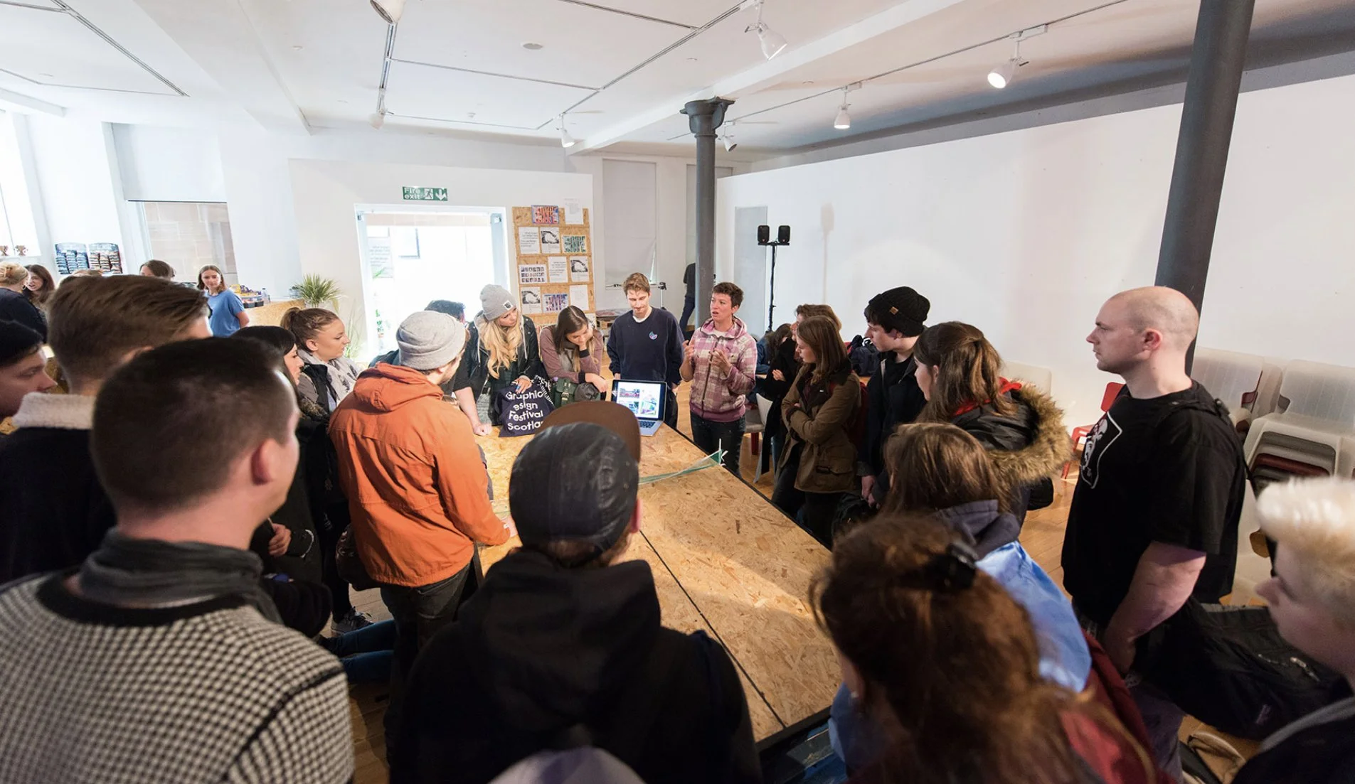 Myself and Amy Whiten of Recoat explaining process for large scale shutter painting workshop to participants. Part of Graphic Design Festival Scotland in 2015. Image source: GDFS