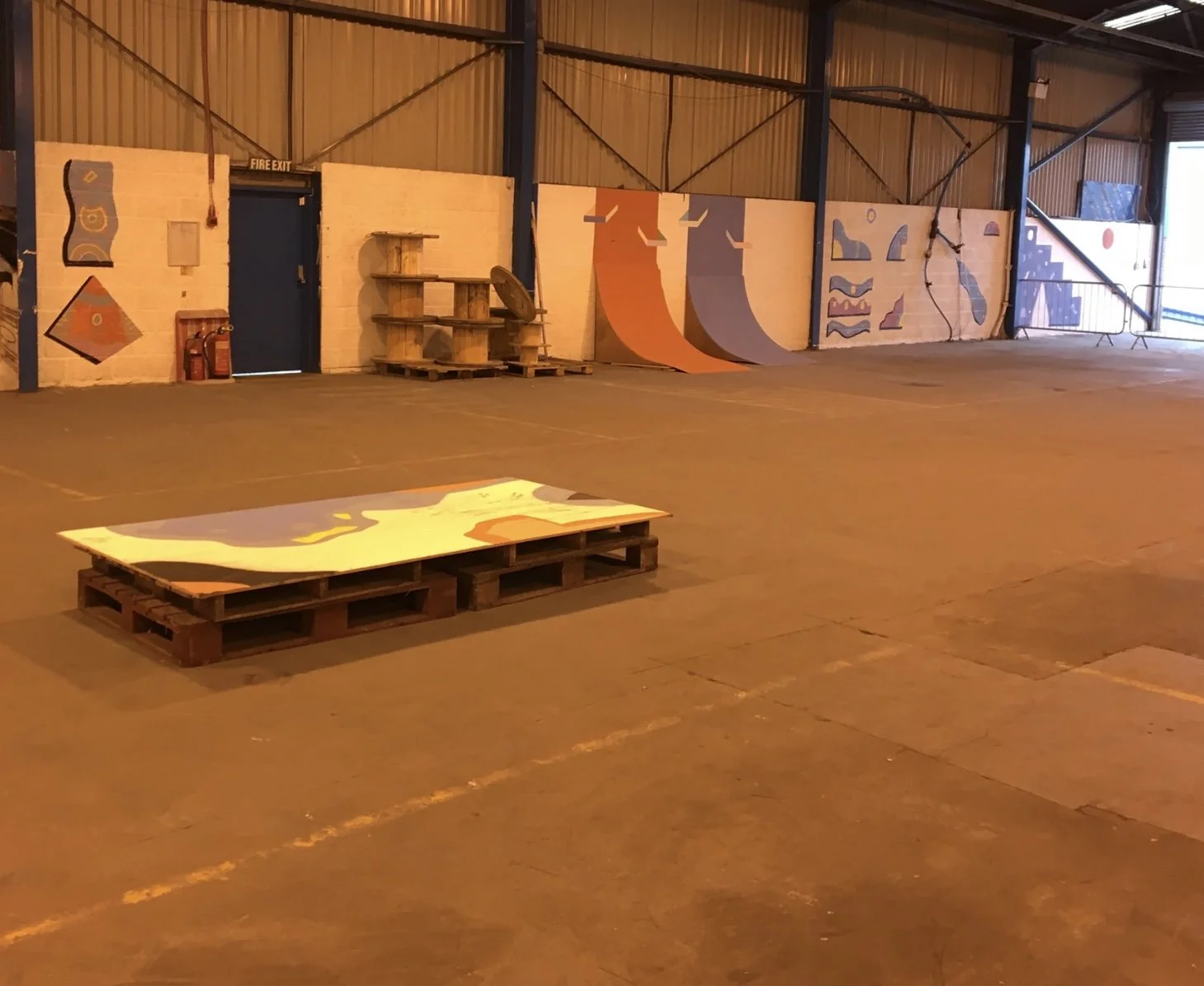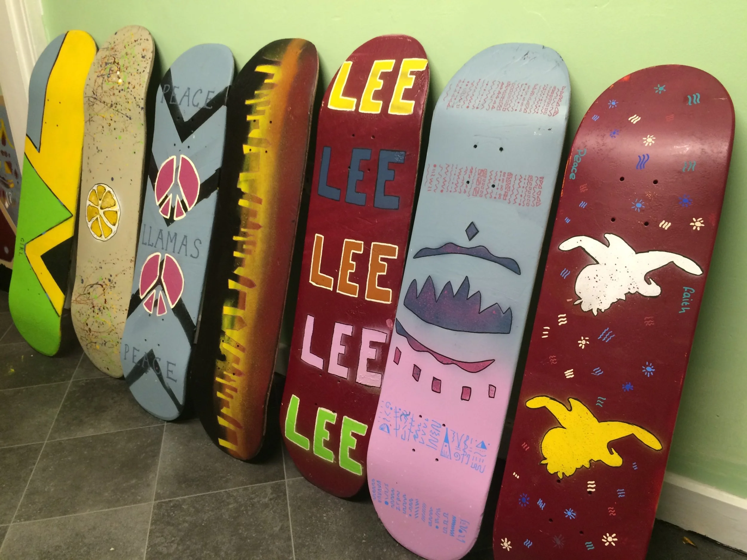 Skateboard designs completed by workshop participants at Becaon Arts Centre. Age group 9 to 13 years.