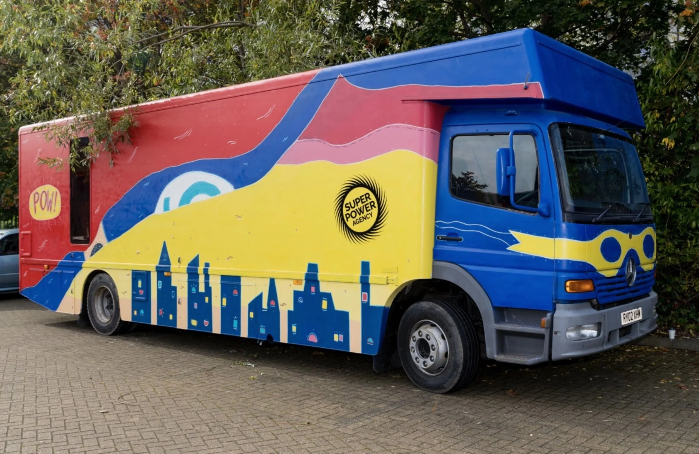 SPA Library Bus, designed in collaboration with S1 pupils at Leith Academy which I then painted on by hand.